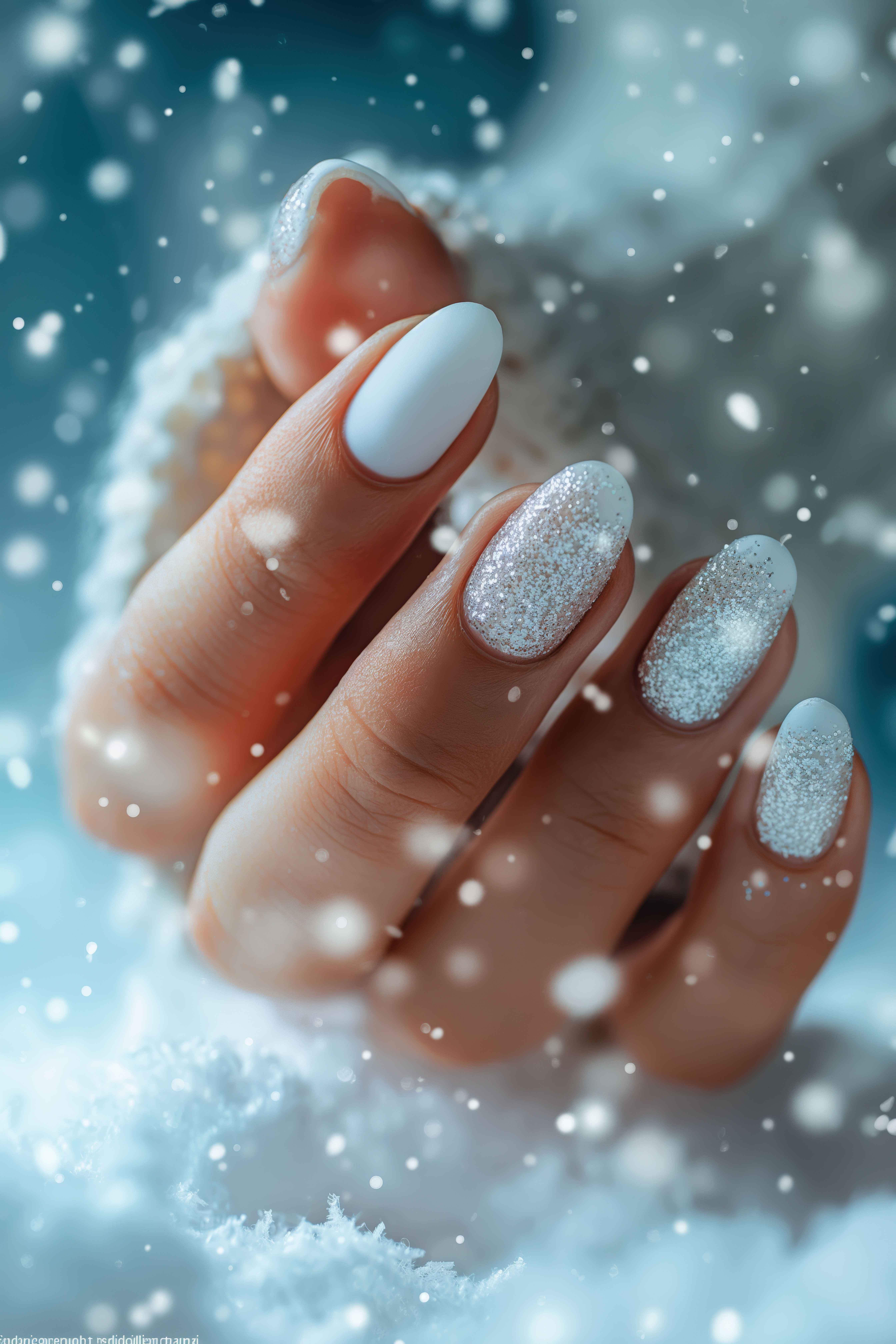 Если вы не любите сложные рисунки, этот вариант для вас. На прозрачной или нежно-перламутровой основе создается эффект инея с помощью белых микроблесток и матового топа. Дополнить дизайн можно одной серебряной полосой по боковой поверхности ногтя. Стильно, свежо и очень элегантно.