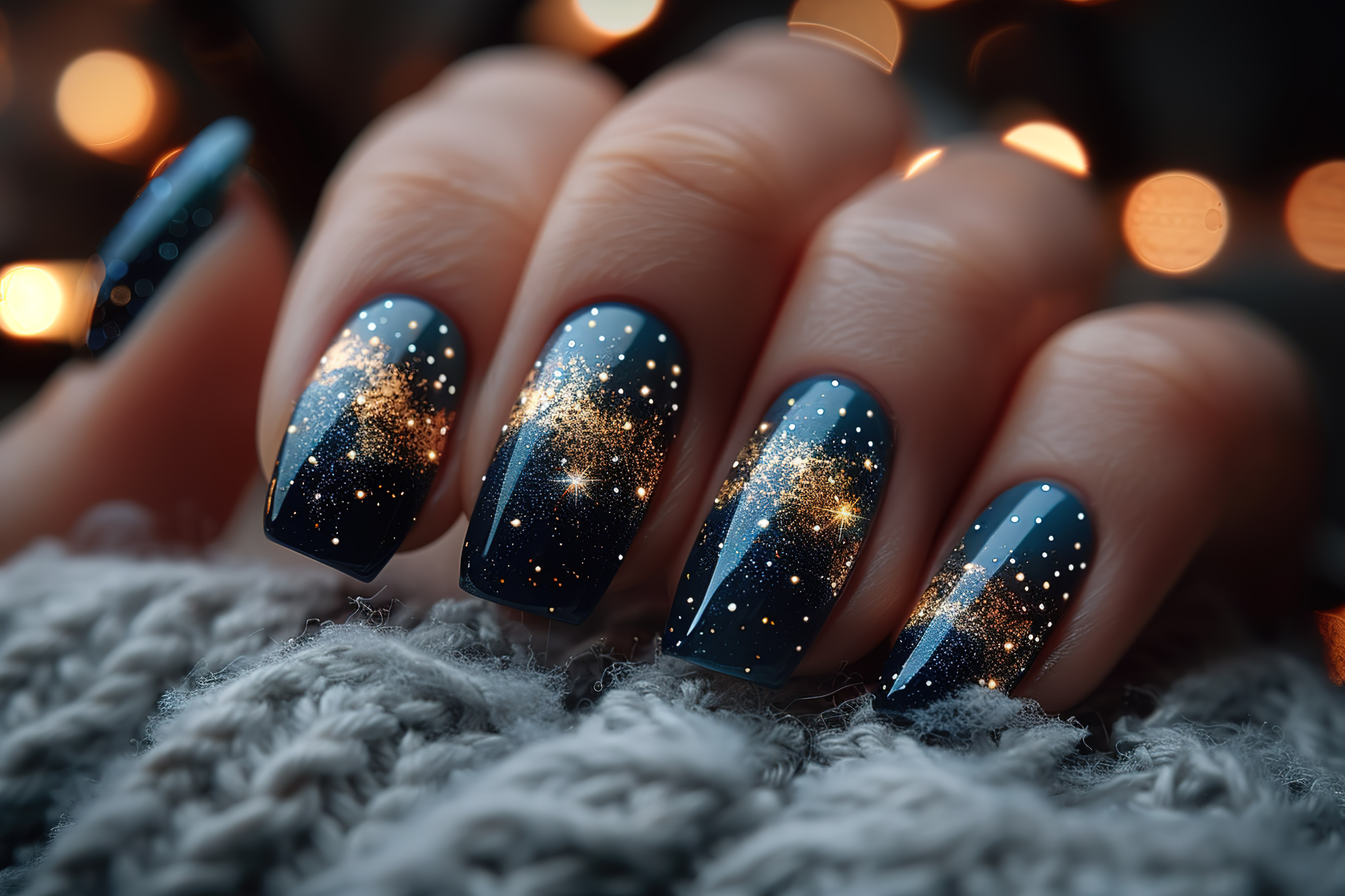 Тема космоса продолжает будоражить воображение и в 2026 году. Вместо простых блесток — сложные градиенты, имитирующие туманности, и точечные акценты, похожие на далекие звезды. Основная палитра: глубокий черный, угольно-синий, фиолетовый, дополненные мерцающими частицами серебра и голографической фольгой. Идеально смотрится техника «галактика» или матовое покрытие с глянцевыми узорами-созвездиями. Это один из самых захватывающих вариантов для новогоднего маникюра.